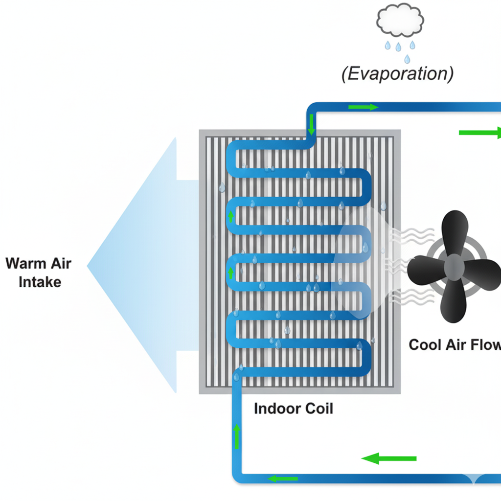 Largimi i "Mbetjes së Ftohtë": Ajri që tashmë është ftohur pasi ka dorëzuar nxehtësinë e tij, menjëherë shtyhet dhe largohet nga njësia, duke i lënë vendin një vale të re ajri më të ngrohtë.